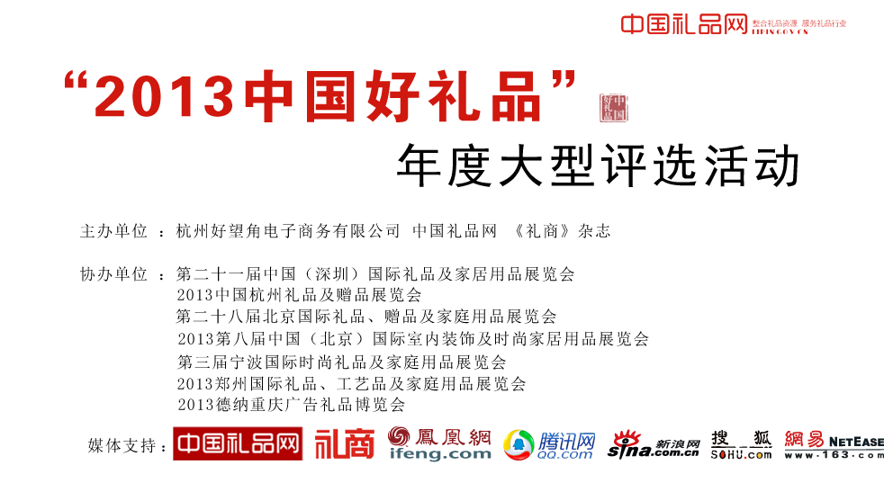 | 中國禮品網將評選結果通過中國禮品網、新浪、網易、搜狐等網站向社會公布。并聯合國內百余家知名媒體對整個活動全程跟蹤報道(報道內容:評選活動啟動報道、入圍企業通告、獲獎企業形象展示、評選結果報道以及今后的經營活動等。) | |||||||||||