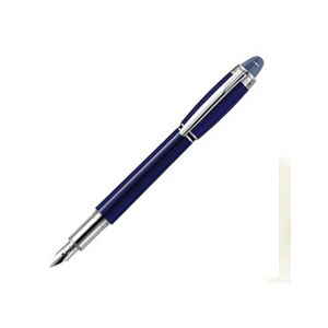 墨芯墨水筆,14K金鍍銠筆咀;亮藍色鍍漆筆桿和筆帽,裝飾金屬紐索紋;透明帽頂,內嵌懸浮萬寶龍標志;高度拋光鍍鉑金筆夾和圓環。