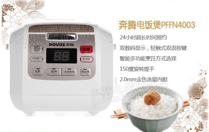 產(chǎn)品名稱:Povos/奔騰 PFFN4003 品牌:Povos/奔騰 型號:PFFN4003 顏色分類:淺灰色 鍋煲容量:4L 控制方式:微電腦式 電飯煲多功能:預(yù)約 定時(shí) 內(nèi)膽材質(zhì):鋁合金 電鍋煲功率:601-800W 售后服務(wù):全國聯(lián)保 外觀造型:方形煲 電飯煲加熱方式:底盤加熱 液晶顯示:有 適用人數(shù):3-4人