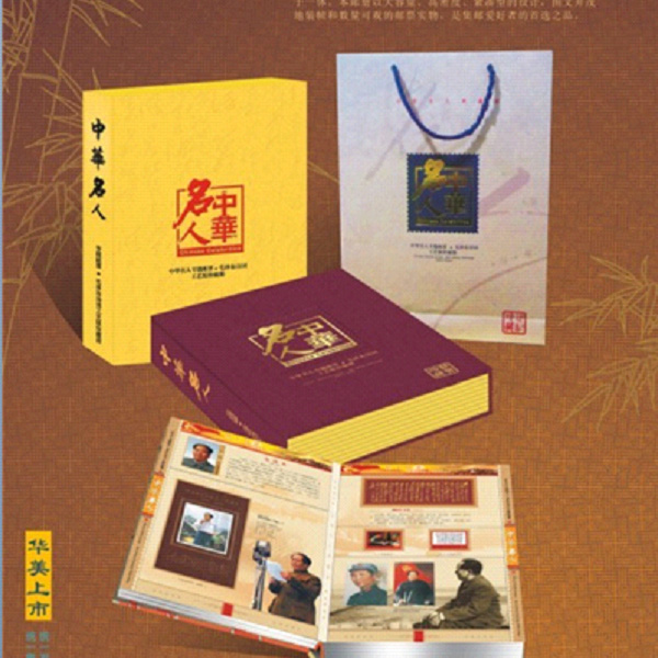 冊內裝幀58位名人,紀念郵票60枚,毛澤東詩詞工藝版金箔3枚。