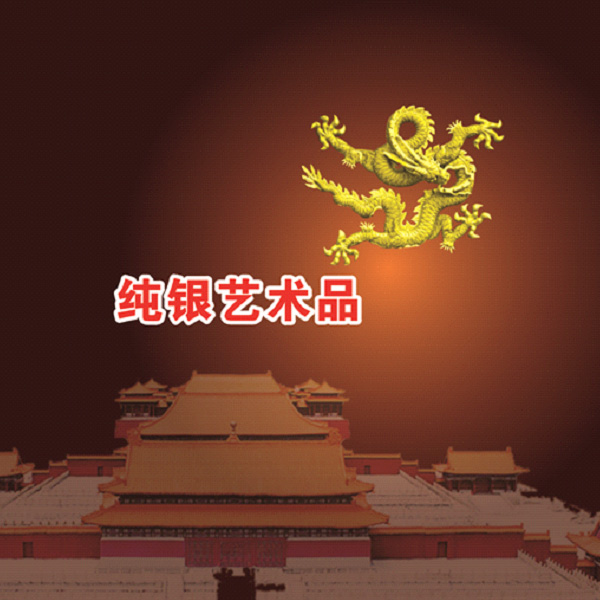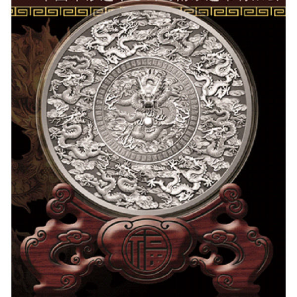 銀盤正面高浮雕九條巨龍,創意來源故宮九龍壁,它蘊藏著皇權和天子之尊的九五之數。九龍周圍56福環繞,象征56個民族共享至尊之福。九龍聚福銀盤是每個擁有者的聚福盤、聚財盤。