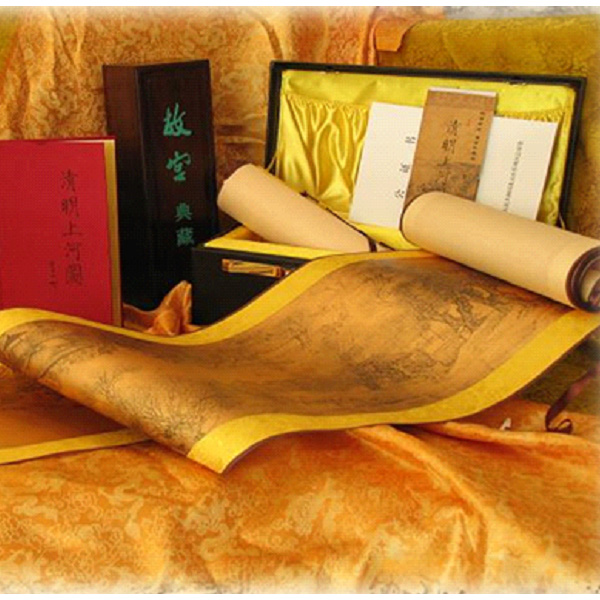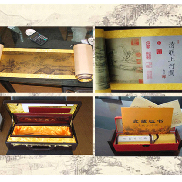 黃金版清明上河圖是根據(jù)故宮博物院所藏北宋畫家張擇端《清明上河圖》的真跡底片,運用特種印刷技術(shù)將《清明上河圖》的原畫按1:1的比例精制而成。它不同于《清明上河圖》的各種仿真品, 而是采用真跡底片直接印刷,這在《清明上河圖》的制作史上是第一次,從而原汁原味地體現(xiàn)了原作的神韻。黃金版《清明上河圖》制作相當精美,首先將純度高達99.9%%的黃金作成黃金“宣紙”,而黃金“宣紙”具有結(jié)構(gòu)細密、質(zhì)地柔軟不變色、防潮防蛀等特點,可以折疊不裂,為畫卷印刷裝幀創(chuàng)造了良好條件。然后再將圖像直接印刷于近7米的黃金“宣紙”上,而7米長的金卷是一張完整的金紙,圖中無一接縫。創(chuàng)造目前國內(nèi)金紙之最。最后再將黃金版《清明上河圖》采用卷軸裝裱,實現(xiàn)了畫卷從內(nèi)容到形式的完美統(tǒng)一。既便于欣賞又利于收藏。理論上可以保存萬年以上。 黃金版《清明上河圖》題頭由北宋畫家、書法家皇帝宋徽宗題寫,由純牛皮密碼箱和紫檀木盒包裝, 畫盒正面的《清明上河圖》采用“紫檀嵌黃楊”手法將千年方能成材的黃楊木鑲嵌而成。