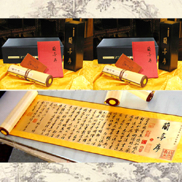 純金版《蘭亭序》金卷軸畫由故宮博物院所藏底版1:1比例精工打造而成,全卷長(zhǎng)達(dá)7米,高0.35米,印刷在成色99.9的黃金宣紙,制作工藝極其復(fù)雜。經(jīng)過(guò)高科技處理后,純金版《蘭亭序》金卷軸畫具備結(jié)構(gòu)嚴(yán)密、柔韌光亮、抗氧化、抗變色的永久珍藏特性。集黃金藝術(shù)品、繪畫珍品、收藏品為一身,具有極高的藝術(shù)和收藏價(jià)值。